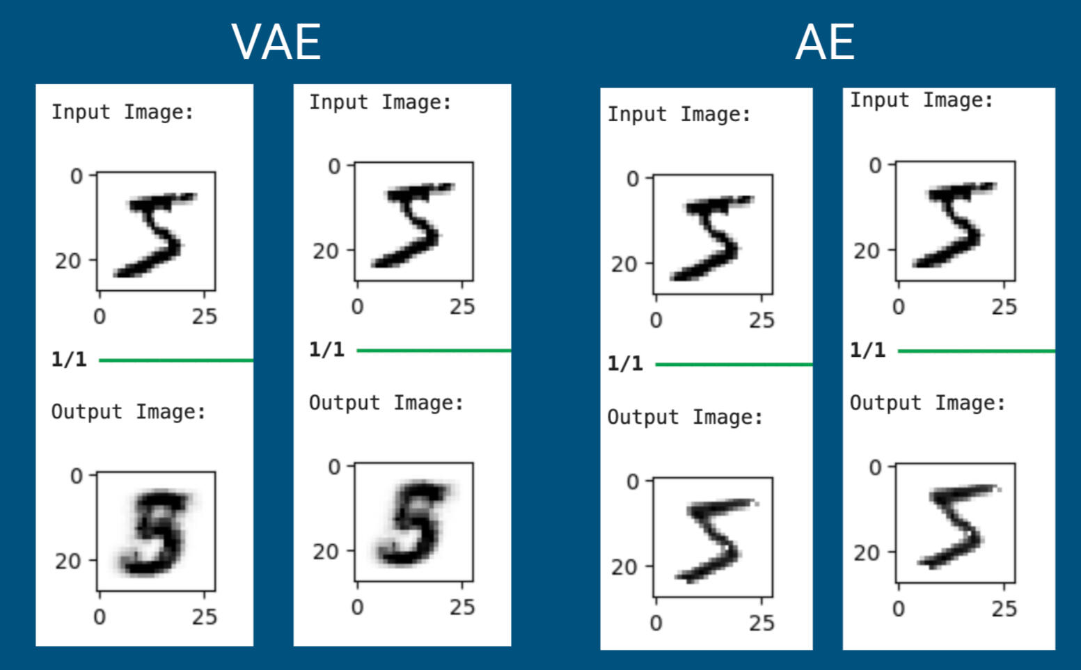 - Showed how basic autoencoders have deterministic outputs while variational autoencoders have probabilistic outputs