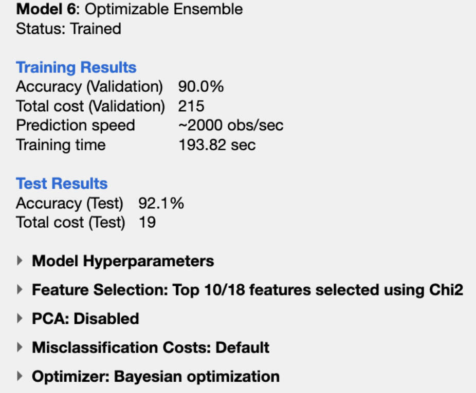 - The model with the highest accuracy was an optimizable ensemble where I got 93.8% test set accuracy with all features, and 92.1% test set accuracy with the 10 best features