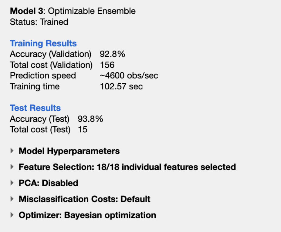 - The model with the highest accuracy was an optimizable ensemble where I got 93.8% test set accuracy with all features, and 92.1% test set accuracy with the 10 best features